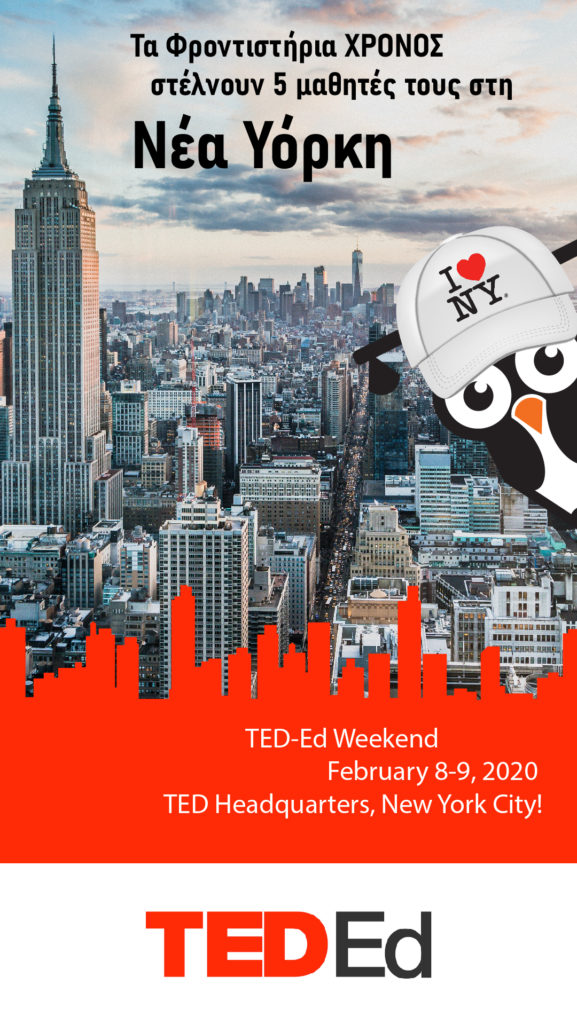 Είμαστε όλοι ενθουσιασμένοι με την τιμητική πρόσκληση που έλαβε το Φροντιστήριό μας από το TED-Ed ώστε 5 μαθητές μας να συμμετάσχουν στο TED-Εd Weekend το οποίο θα πραγματοποιηθεί στις 8 και 9 Φεβρουαρίου 2020 στα κεντρικά γραφεία του Οργανισμού στην Νέα Υόρκη.
